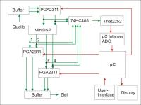 Der Plan währe also, ein Huckepack-Board das auf das MiniDSP gesteckt wird, darauf dann der Controller und die TI-PGA Regler, dazu eine Platine für die Gerätefront mit Display+Knöpfe und entweder Schraubterminals für die Ein und Ausgänge oder eine seperate Platine für die Geräterückwand.