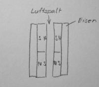 Bei dem Prototypen kann man sehen, dass ich den Luftspalt deswegen auch entsprechend großzügig eingestellt habe. Außerdem ist die Anordnung der Magnete ungünstig, weil sich das Magnetfeld im Luftspalt teilweise wieder auslöscht.