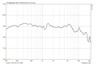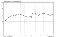 Eine interessante Beobachtung: dieser Treiber ist so klein, dass bereits die Öffnung in einer 19 mm dicken Spanplatte als Helmholtzresonantor im Nutzband fungiert und eine schöne Resonanz herbeizaubert. Daher habe ich diesen Treiber (und andere kleine) extra in einer dünnen Sperrholzplatte gemessen. Damit war von der Resonanz nichts mehr zu sehen.