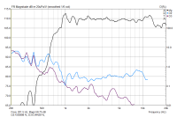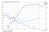 Ich krame den Thread noch mal hervor, um ihn mit meinen Messungen eines Exemplars anzureichern. Gemessen wurde in 1 m Entfernung. Der Treiber wurde grob entzerrt, da der Amplitudengang sehr merkwürdig ist. Außerdem habe ich eine bedämpfte Rückkammer aus Pappe rangebastelt (naja, hingepfuscht Wink.